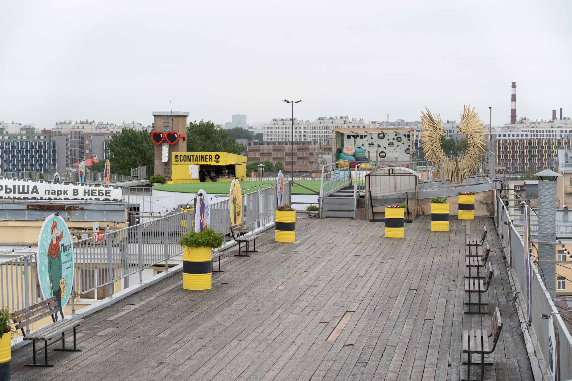 Лучшие годы пространства на Лиговском проспекте, кажется, остались позади, но в «Этажах» по-прежнему работает открытая обзорная площадка на высоте 27 метров. На крыше площадью больше тысячи квадратных метров поставили скамейки и оборудовали фотозоны, а в выходные дни здесь можно выпить коктейль.