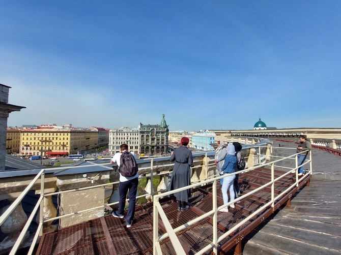 Небольшая смотровая площадка есть и на колоннаде Казанского собора: посетить ее можно после обзорной экскурсии по храму. Подниматься туда нужно по узкой лестнице, обзор ограничен: с колоннады можно увидеть дом Зингера, канал Грибоедова и часть Невского проспекта.