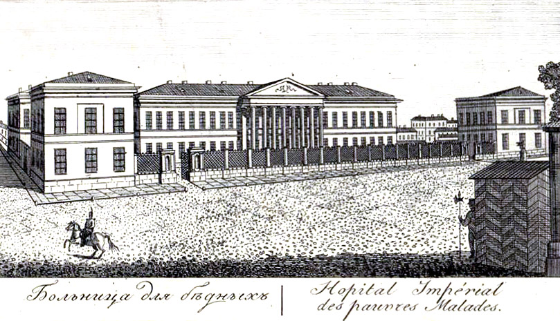 Старейшая петербургская больница из числа лечебных учреждений общего пользования — Мариинская. Условия там были хорошие, порядка 400 мест для больных, работали сестры милосердия. Поступить туда мог всякий больной, плата за лечение не взималась. Если поступал на лечение крепостной, то его лечение оплачивал хозяин. С тех, кто не мог заплатить, деньги не брали.