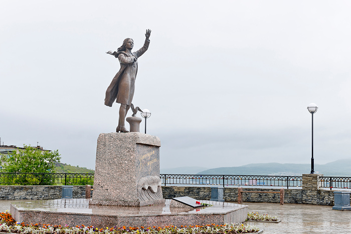 С площадки, на которой установлен памятник, открывается вид на Кольский залив и уходящие из порта суда.