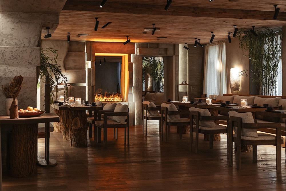 Заведение оформили в стиле сибирского дома: в интерьере много дерева, камня и сухоцветов.