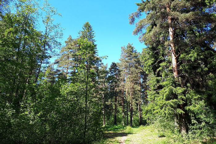 Маршрут начинается у Лисинского лесного колледжа, бывшего Императорского охотничьего дворца и проходит по территории заказника «Лисинский». По пути встретится дендропарк с деревьями из разных стран мира (учебная лаборатория под открытым небом), аллея вязов, а также старинные дубы, которым почти 200 лет. Добраться можно от станции «Лустовка», куда ходит поезд от Витебского вокзала.