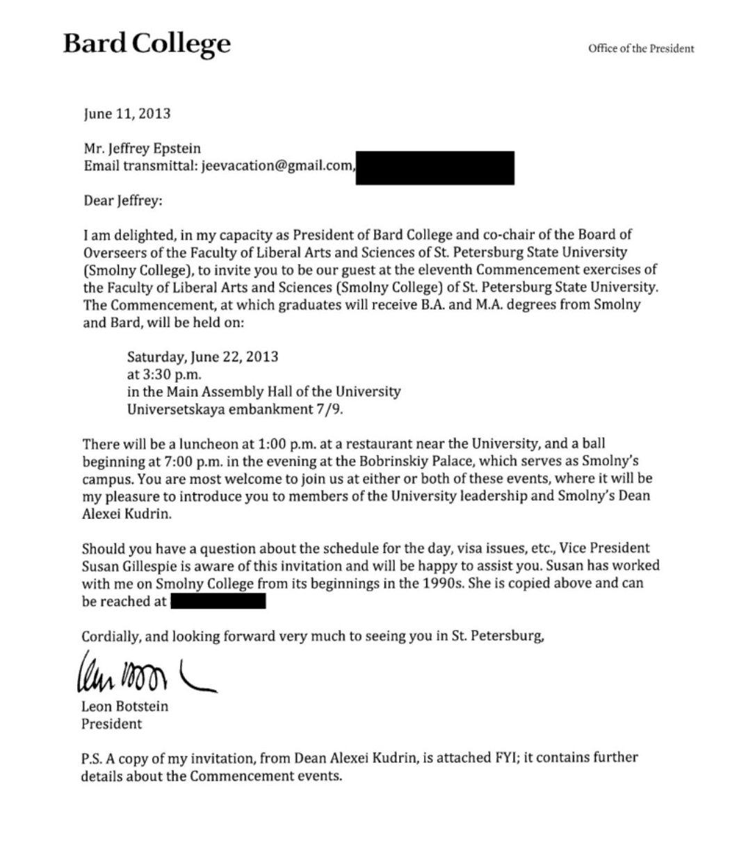 В мае 2013 года на тот момент декан факультета свободных искусств и наук Алексей Кудрин отправил президенту Бард-колледжа Леону Ботстайну приглашение на церемонию вручения дипломов. В свою очередь Ботстайн позвал с собой в Петербург Джеффри Эпштейна. Приглашение в СПбГУ американскому финансисту также отправлял один из основателей факультета Валерий Монахов.