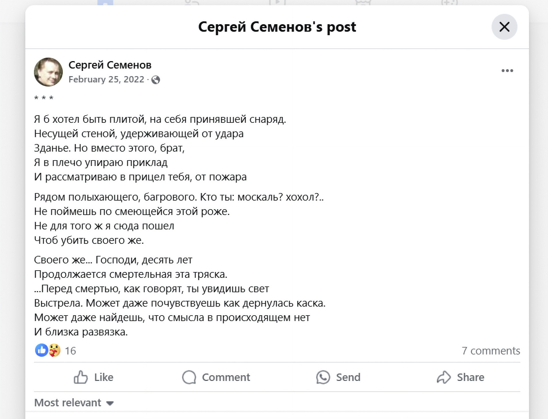 В конце февраля 2022 года петербургский поэт Сергей Семенов выложил в фейсбуке видео с лозунгом «Нет путинской войне в Украине» и свое стихотворение о бессмысленности боевых действий: