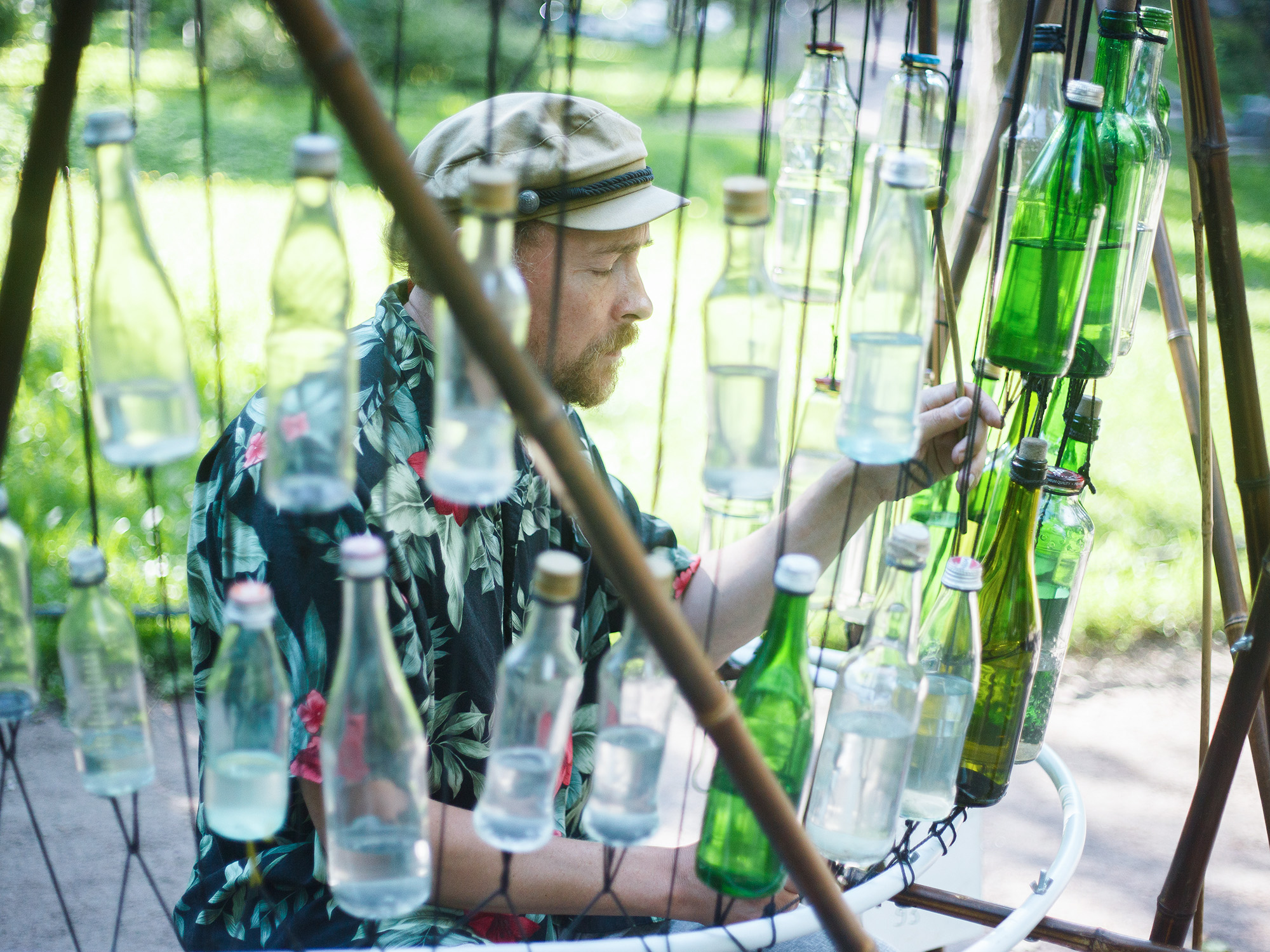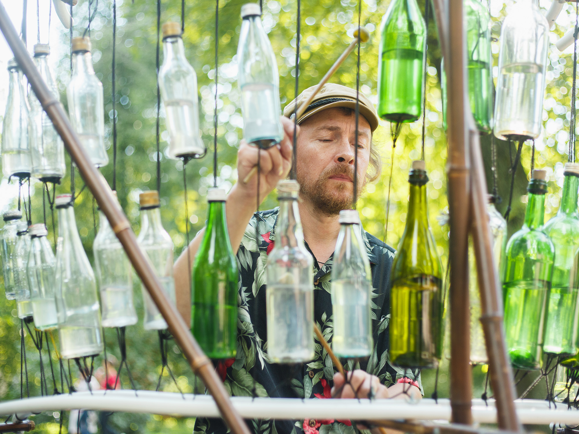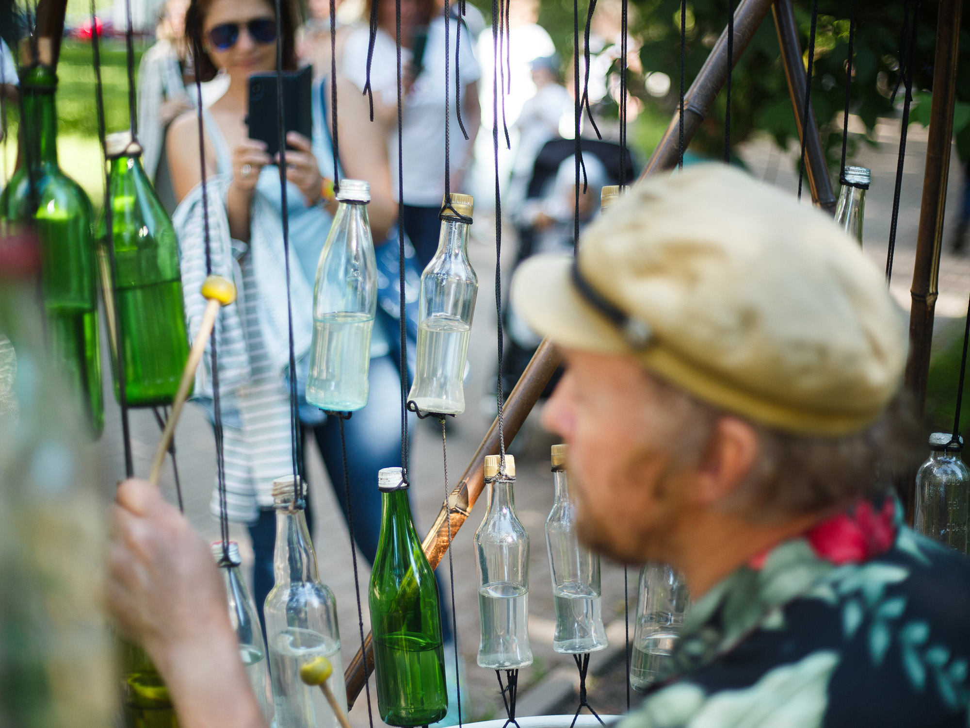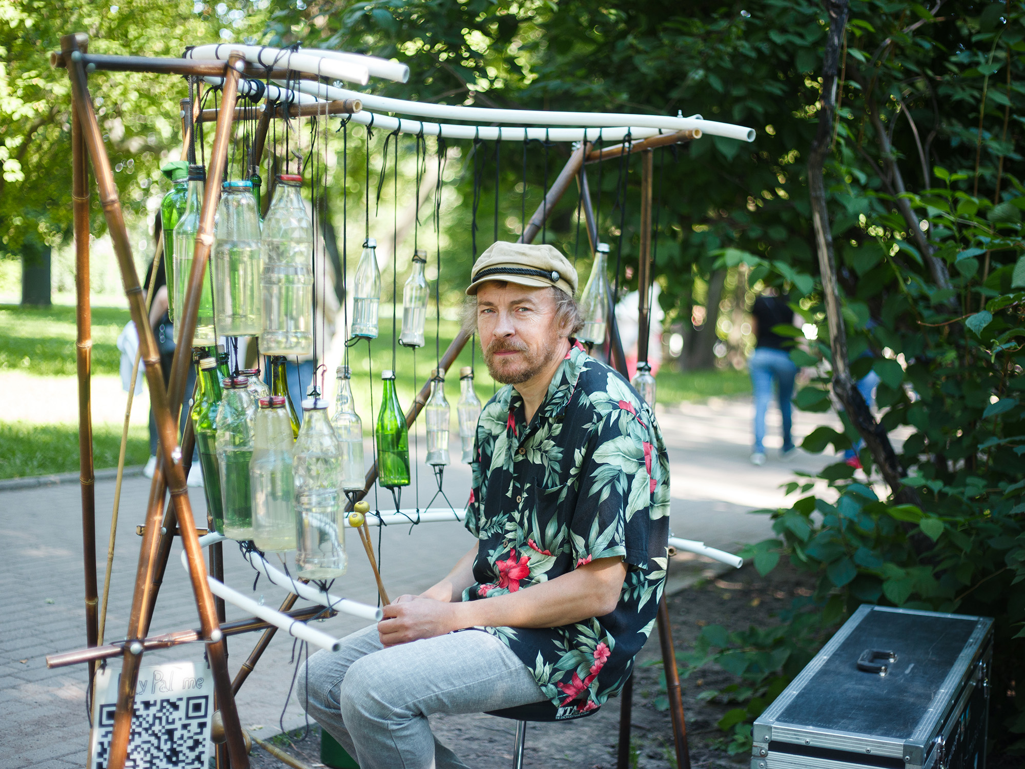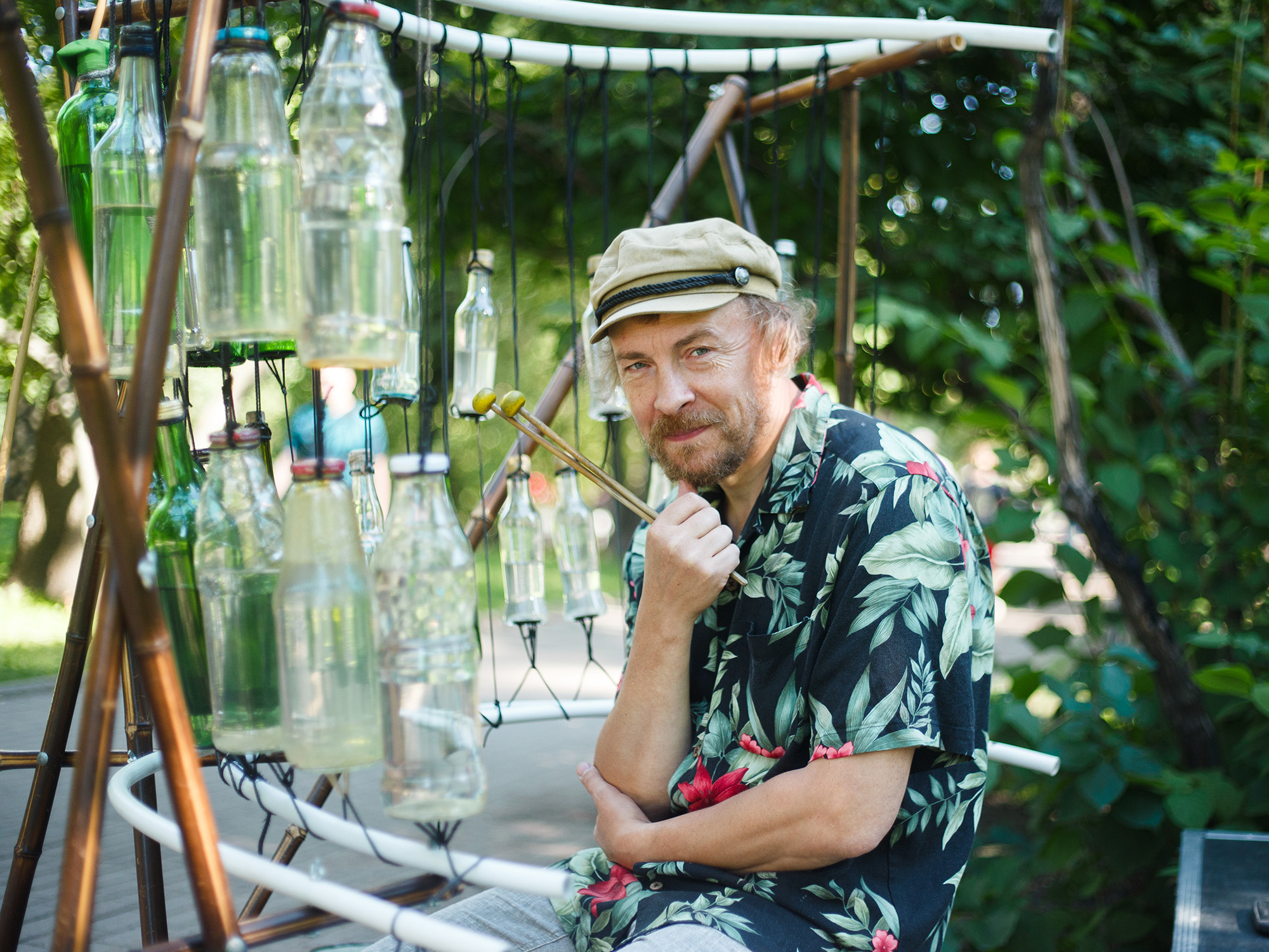 Петербуржец Федор Григорьев играет на очень необычном инструменте — бутылофоне. Это пара десятков стеклянных бутылок с водой, подвешенных к конструкции из бамбука.