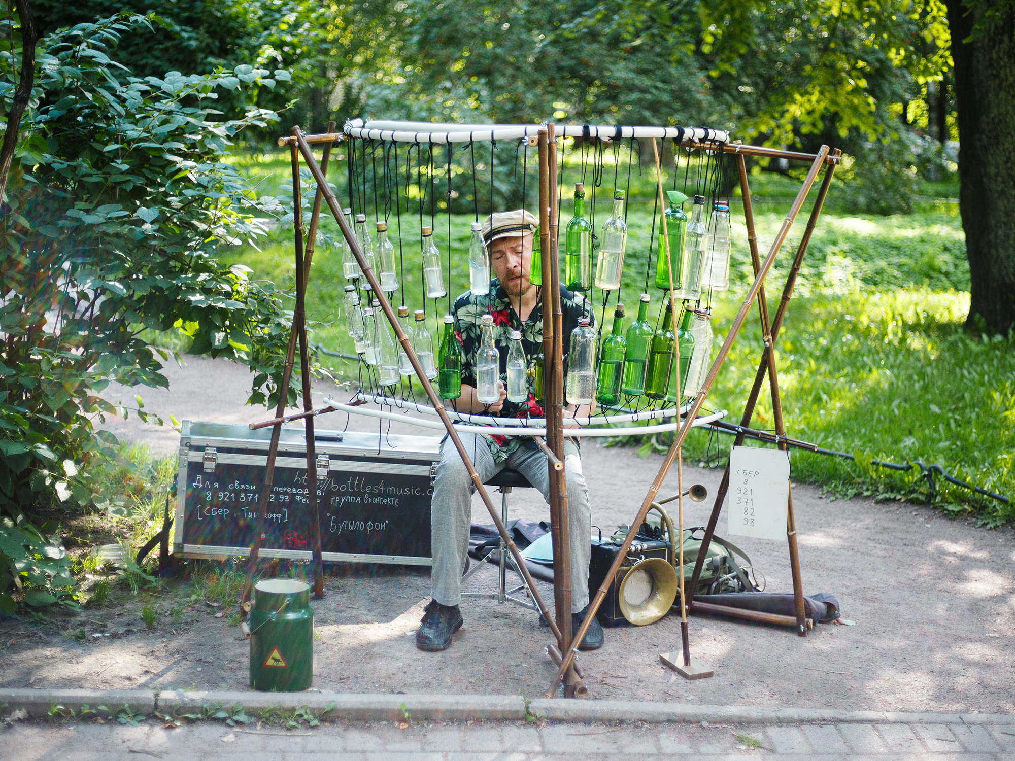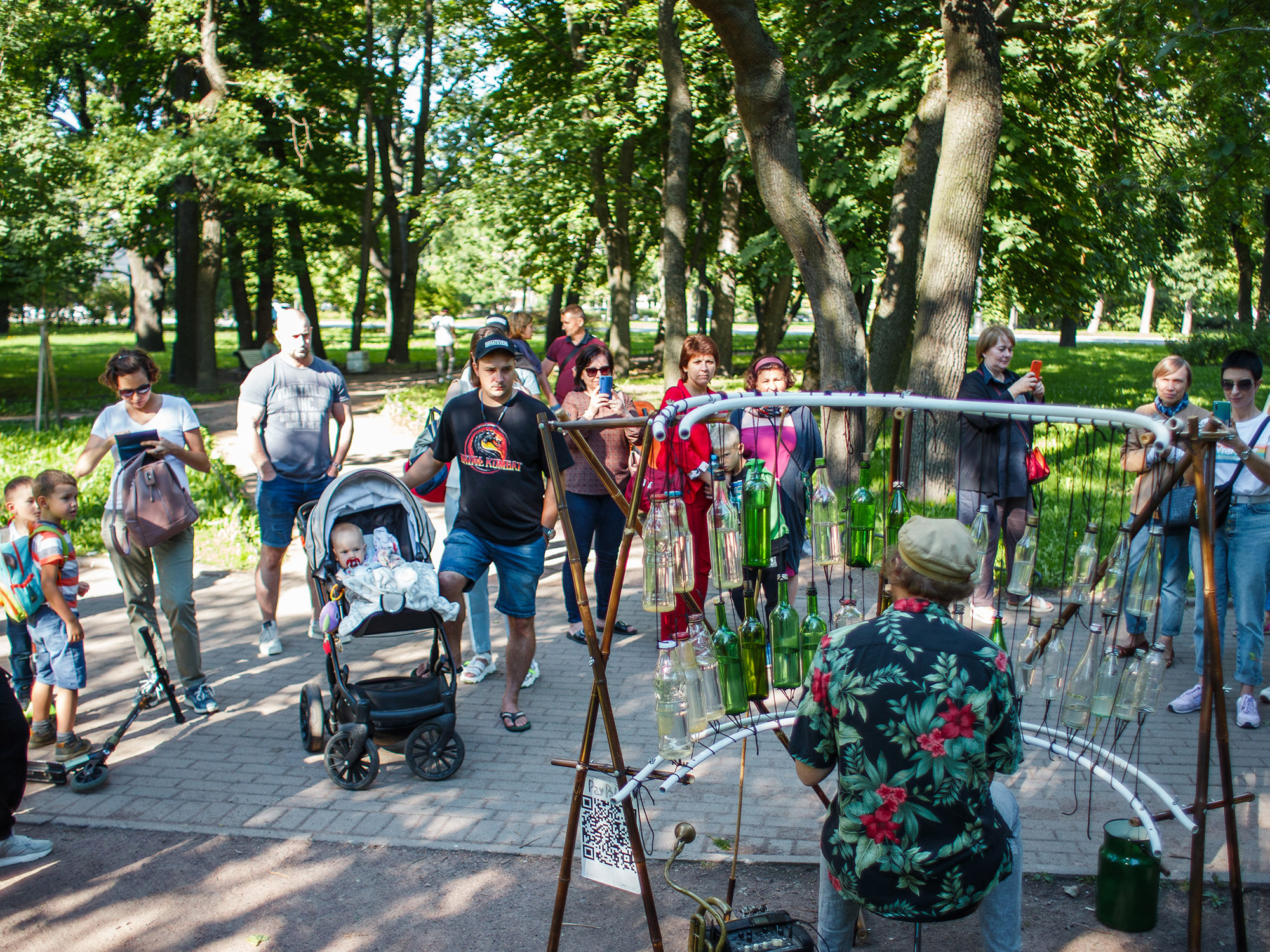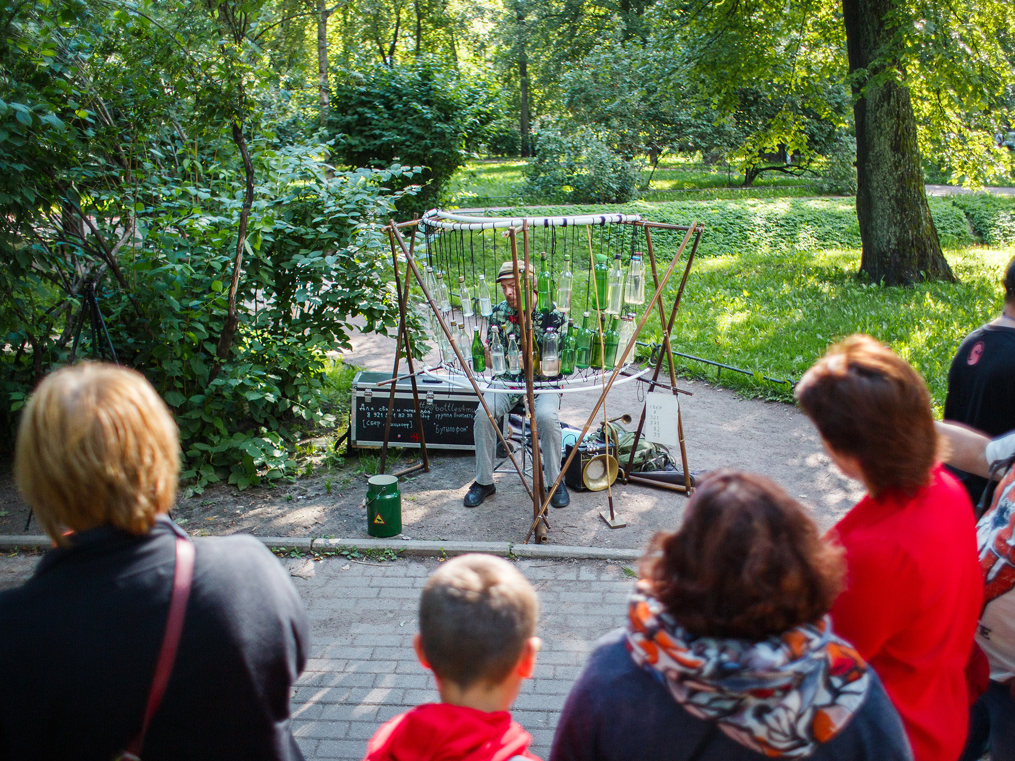 В Александровском парке, где мы встретились с Федором, было именно так. Многие взрослые остановились возле музыканта, потому что бутылофон понравился их детям. Несколько ребят танцевали и хлопали в ладоши, а маленький мальчик в коляске не моргая наблюдал за игрой Федора — будто это его любимый мультфильм.