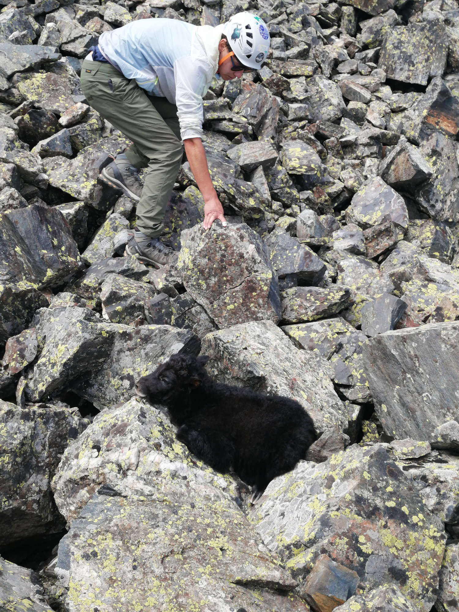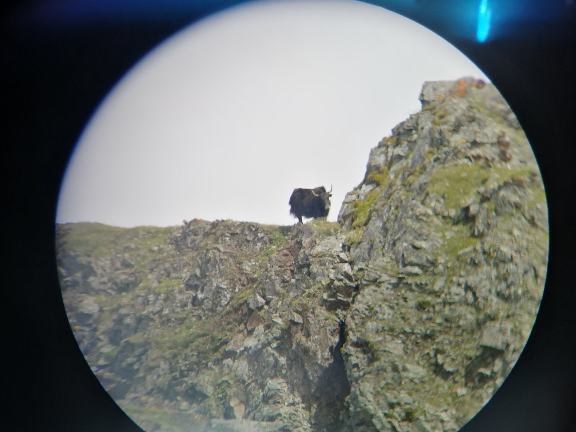 Пока мы ждали, яки уходили все дальше, и теленок сильно отставал от них: из-за своего размера ему было трудно передвигаться по крупной осыпи. Это выглядело забавно, но внезапно он застрял в камнях и не смог двигаться. Взрослые яки стремительно уходили вдаль.