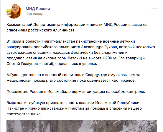 Около 14:00 МИД России разместил официальное объявление, в котором сообщил, что врачи военного госпиталя в пакистанском городе Скарду оценивают состояние альпиниста как тяжелое.