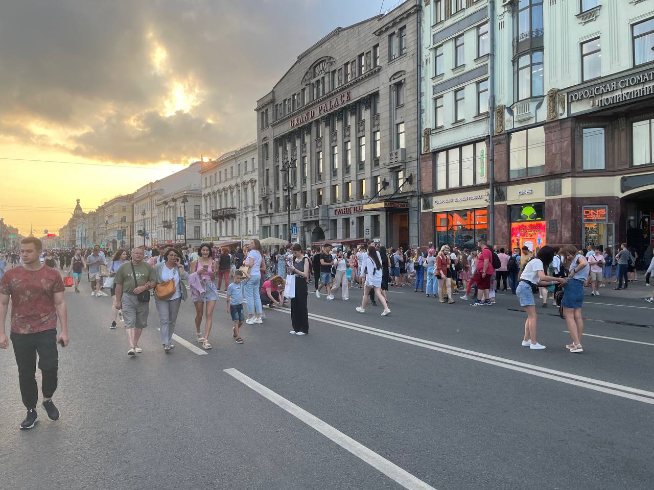 Невский проспект перекрыли от Дворцовой площади до Садовой улицы. Из-за этого у Гостиного двора начались народные гуляния и концерт уличных музыкантов.