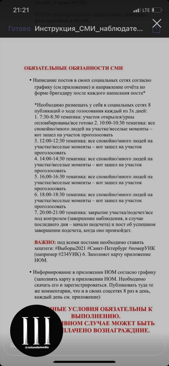 Утром телеграм-канал «Ротонда» сообщил, что «провластным наблюдателям» выдали «методичку» о том, что постить в соцсети. В частности, там написано, что обязательная задача — постить в соцсети сообщения о том, что на участке всё хорошо, и подмечать забавные моменты: например, что пришел кот.