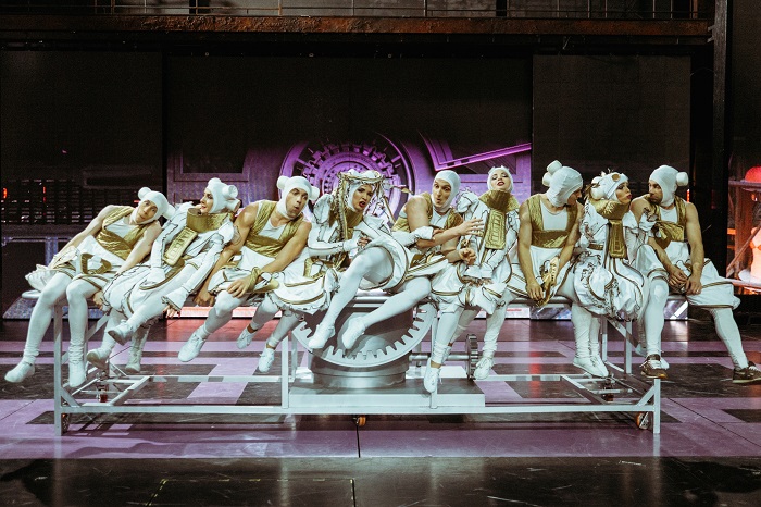 Своим оформлением зал театра напоминает американское кабаре. В стенах расположено множество тайных проходов, которые позволяют актерам появляться в любом месте. Сцена состоит из 28 двигающихся площадок, которые можно переставлять местами.