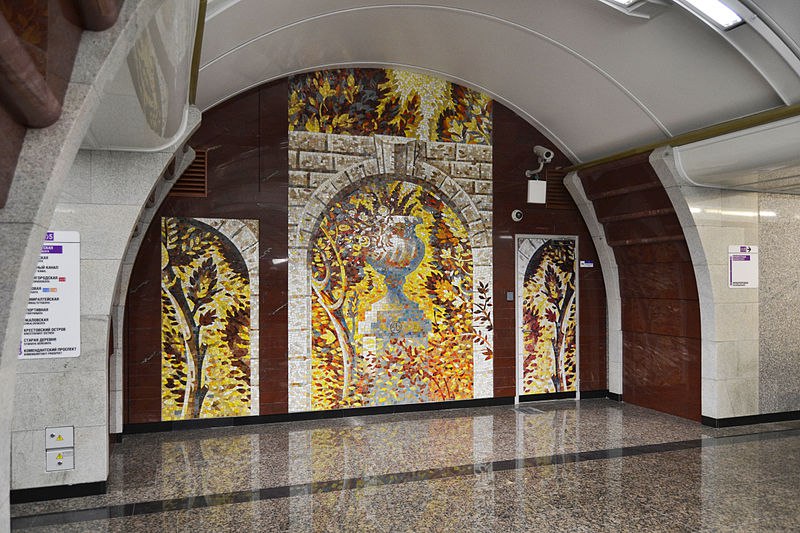 На стенах центрального зала есть мозаичный орнамент, где символично показан осенний лес: канва из оранжево-красных вкраплений и в одном единственном месте — синичка. Я даже слышал, что есть такая байка: если ее находишь, можешь загадать желание. Не могу достоверно сказать, так это или нет, но синичка действительно есть. Разработчик мозаичного убранства — Александр Быстров, замечательный петербургский мозаичист, академик Российской академии художеств. Он участвовал в создании убранства большого количества станций нашего города, введенных за последние 30 лет. На «Спортивной», к слову, его известная мозаика посвящена древнегреческим спортсменам — основоположникам современных Олимпийских игр.