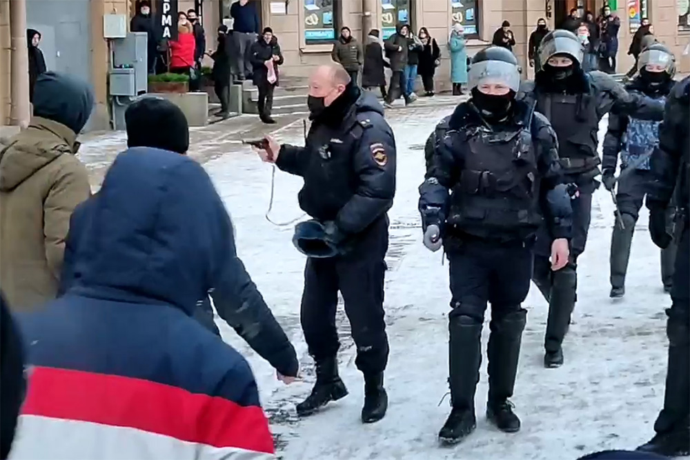 На акции 31 января в поддержку Навального и против действующей власти полицейский направил табельное оружие на протестующих. Это произошло на Сенной площади. Показываем скриншот из видео «Фонтанки».