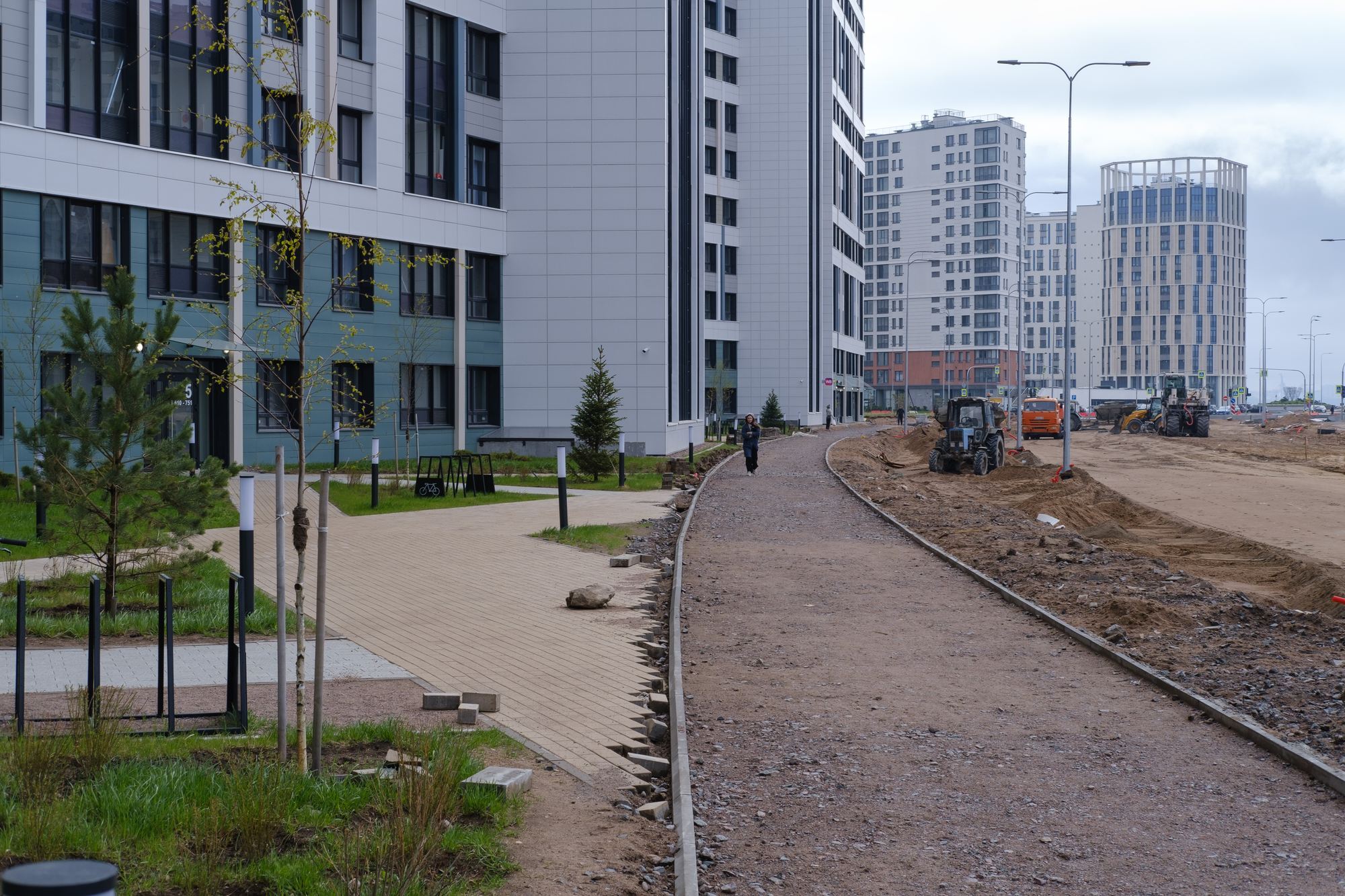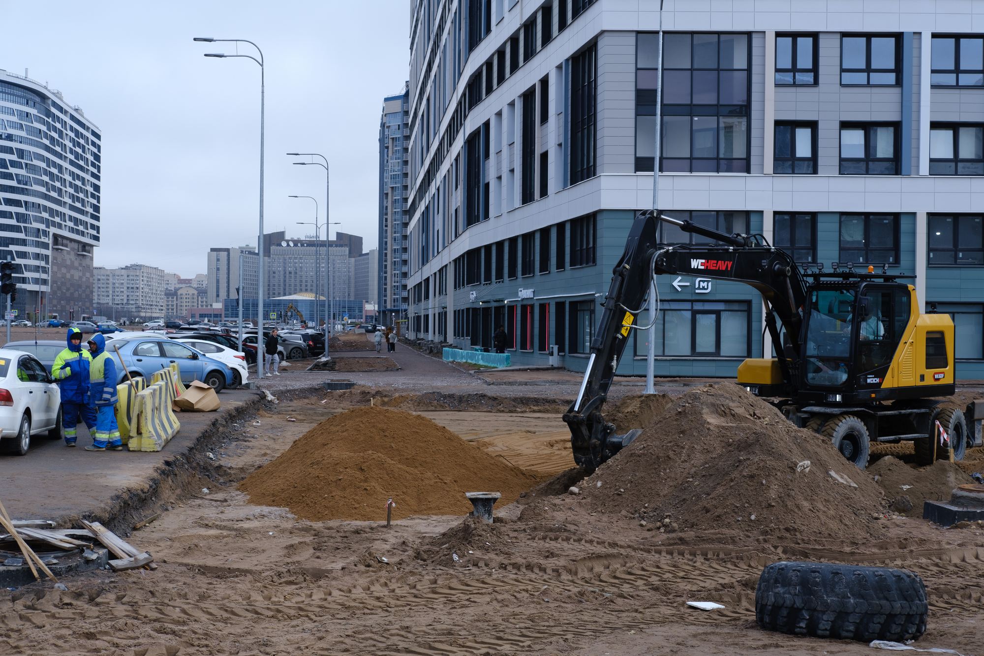 Сейчас жилые кварталы на намыве Васильевского острова выглядят, как стройка. Дороги и тротуары перекопаны, хотя строительство ЖК и другой инфраструктуры закончилось еще в 2021 году.