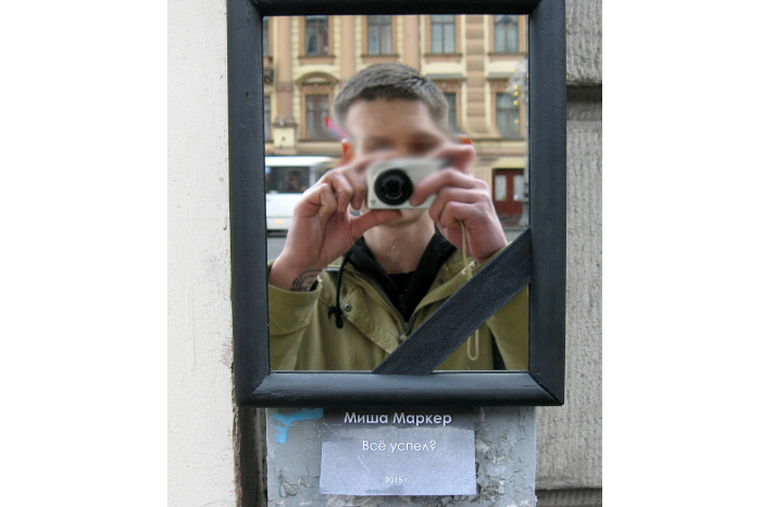 На этот раз работа под названием «Все успел?» представляет собой зеркало с траурной рамкой.