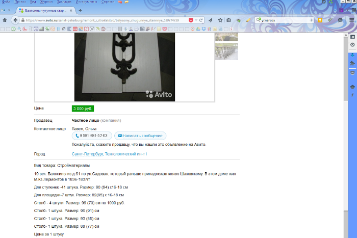 В объявлении отмечается, что балясины XIX века взяты из дома 61 по Садовой улице, принадлежавшего ранее князю Шаховскому. Продавец оценил каждое изделие в 3 тысячи рублей. На продажу выставлена 41 штука для ступеней и семь — для площадки.