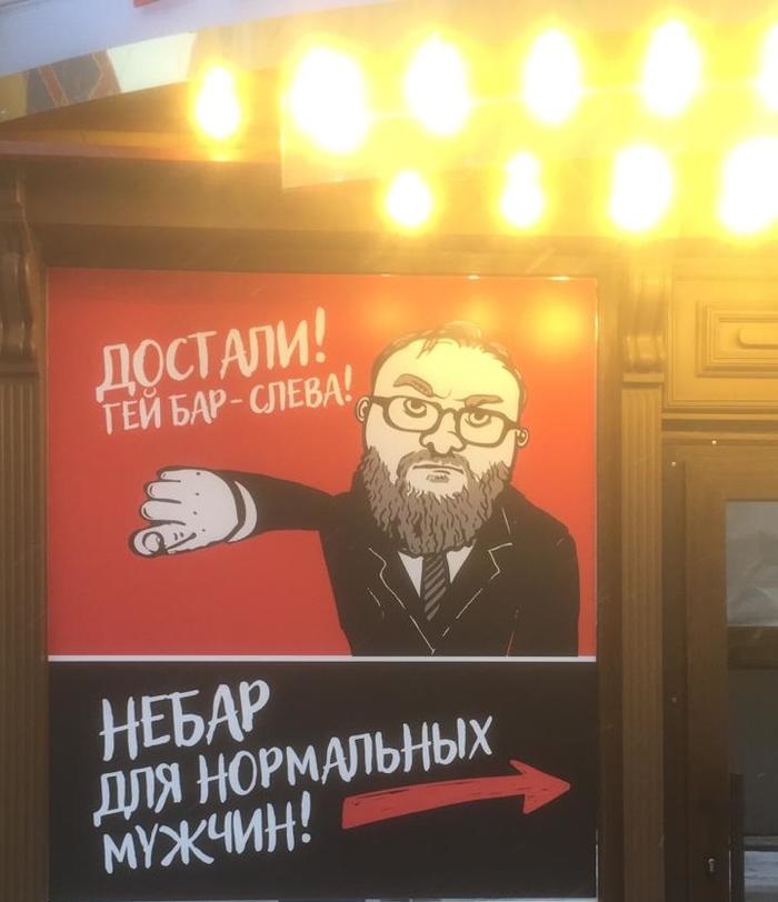 Бар Nebar на улице Ломоносова, 1 вывесил плакат, на котором изображен депутат Виталий Милонов, с надписью: «Достали! Гей-бар — слева! Небар для нормальных мужчин!». Внимание на это обратил пользователь «Пикабу».
