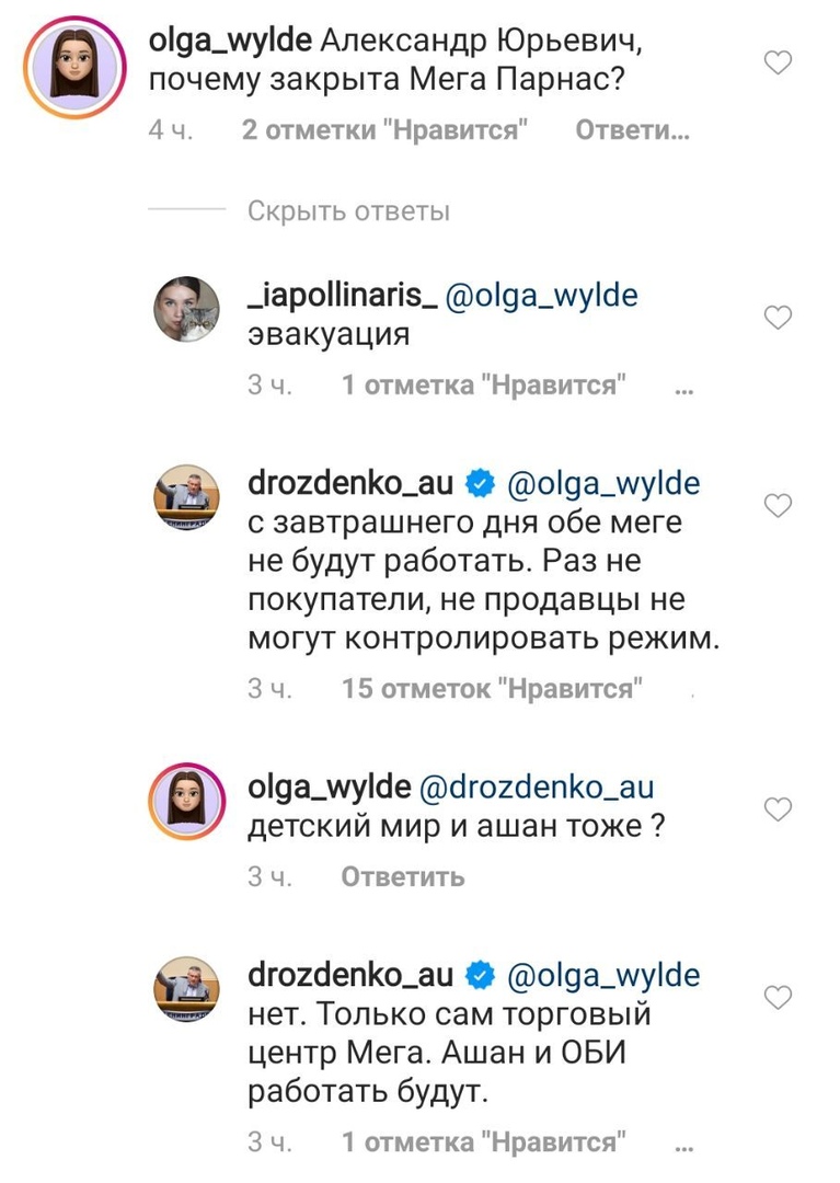 Губернатор Ленобласти Александр Дрозденко в инстаграме сообщил, что торговые центры «МЕГА Дыбенко» и «МЕГА Парнас» с 17 мая снова закроют — из-за того, что покупатели и продавцы не соблюдали рекомендации властей. «Ашан» и OBI при этом продолжат работу.