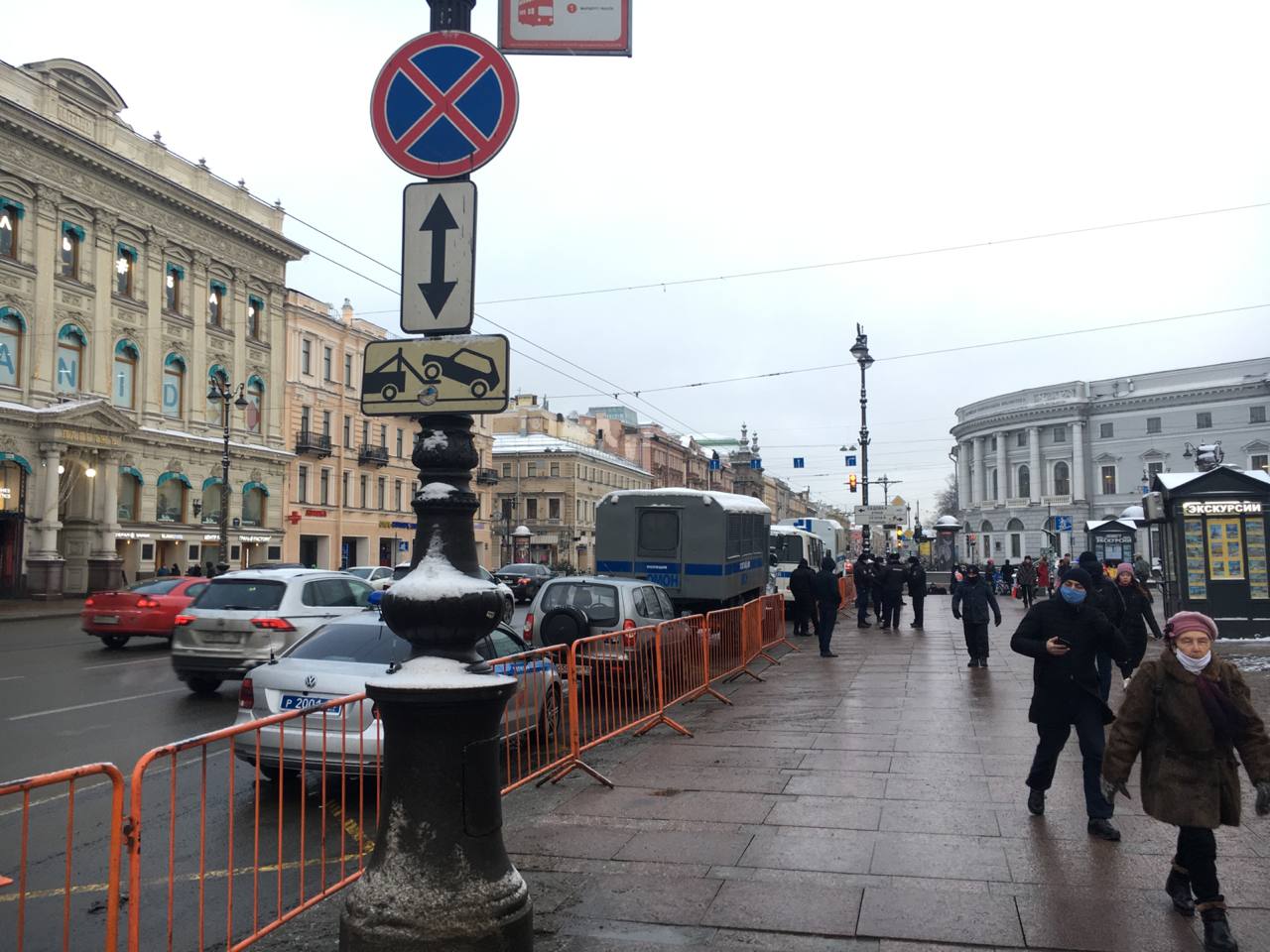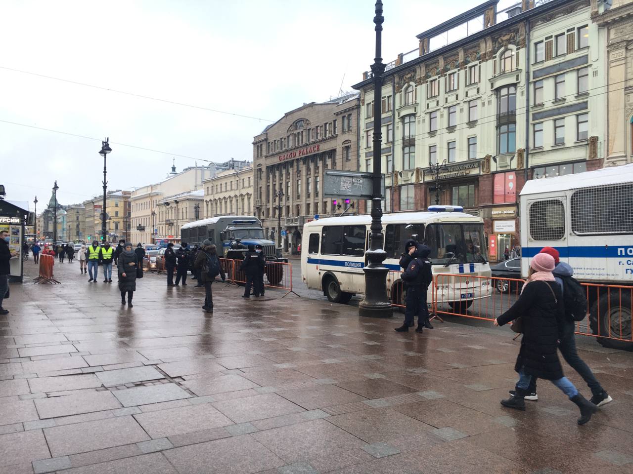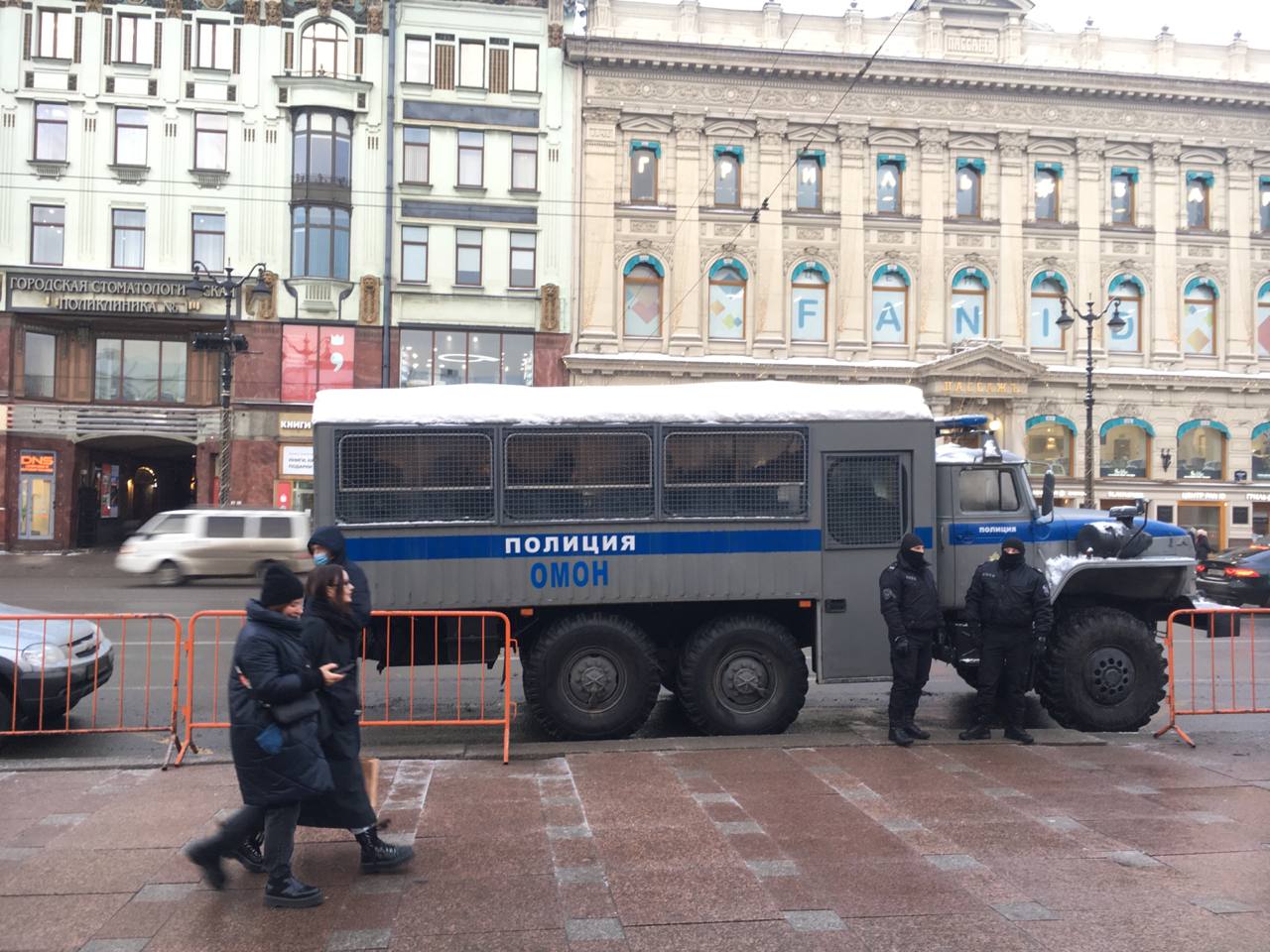 У Гостиного двора, где задержали нескольких участников одиночных пикетов, стоят автомобили ОМОНа. Невский проспект по двое патрулируют полицейские. Как пишет «Эхо Москвы в Петербурге», сотрудников полиции также заметили на Дворцовой площади.