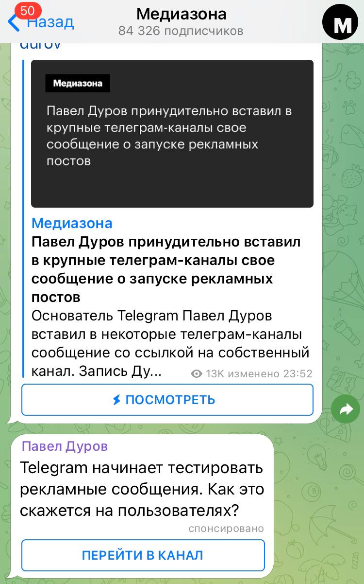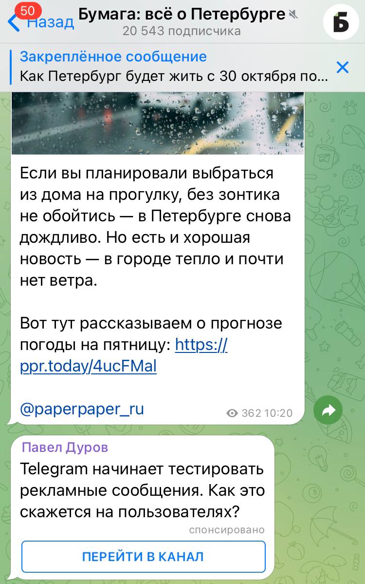 Telegram запустил тестирование рекламы. Пост об этом появился в крупных каналах со ссылкой на основателя мессенджера Павла Дурова.