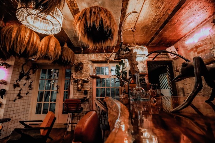 В ресторане выставили скульптуры и арт-объекты, а пространство разделили на несколько зон. Гости могут сесть за chefs table с сет-меню или за большой стол на 12 посадок, сделанный из тропической древесины махагони. Кроме того, в заведении есть каминная зона зимнего сада и барные столики в витражном атриуме.