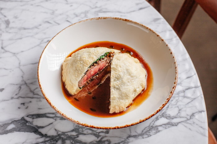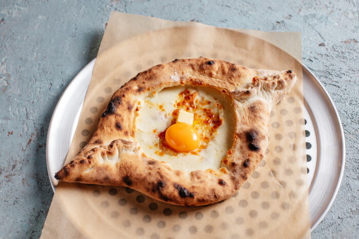 В некоторые интернациональные блюда Никитин добавил грузинские ноты: тартар из говядины подается с эспумой из лукового крема и аджики, а лосося сопровождает соус киндзмари. Отдельный раздел меню выделили под выпечку — там есть шесть видов хачапури, среди которых встречаются позиции с необычными начинками (например, с креветками и сулугуни).