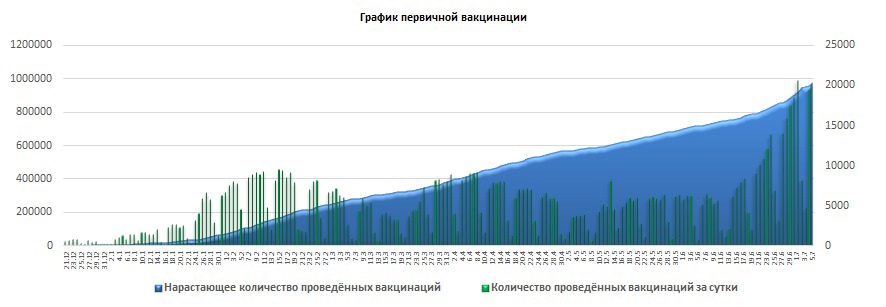 С 1 июня по 8 июля в Петербурге первично привили более 325 тысяч человек, то есть чуть меньше трети от общего числа вакцинированных за полгода. С начала июля, по официальным данным, в городе первично вакцинируют около 20–21 тысячу человек. При сохранении таких темпов к концу июля в Петербурге привьют еще около 470 тысяч человек.