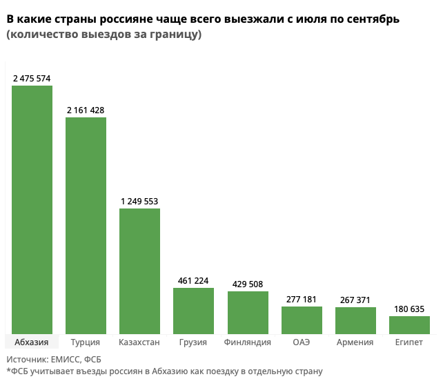 Больше всего поездок россияне ездили в Абхазию — с июля по сентябрь ФСБ зафиксировали почти 2,5 миллионов поездок по этому направлению. На втором месте оказалась Турция — почти 2,1 миллионов поездок. В РБК отметили, что с 2018 году Абхазия и Турция являются самыми популярными направлениями среди жителей России.