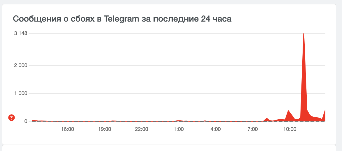 В работе Telegram произошел длительный сбой. Первые сообщения о неполадках появились в 10 утра, они продолжают поступать и в 13:30, сообщает сервис Downdetector.