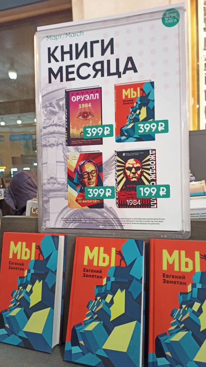 Посетители магазина сфотографировали стенд, на котором разместили «книги месяца». В список вошли сразу два издания «1984» Джорджа Оруэлла, «Мы» Евгения Замятина и «451 градус по Фаренгейту» Рэя Брэдбери. В комментариях набор назвали «замечательным» и посчитали, что в него можно было добавить «О дивный новый мир» Олдоса Хаксли.