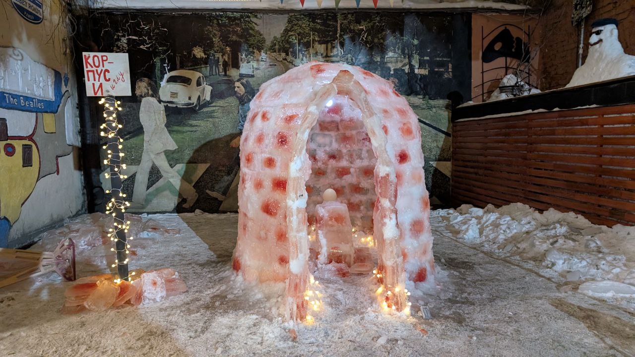 Детали. Чтобы построить корпус «И», организаторы проекта полторы недели готовили красные ледяные кирпичи. «И — ЗНАЧИТ ИГЛУ 🥶», — прокомментировали название пространства в телеграм-канале «Пушкинской-10».