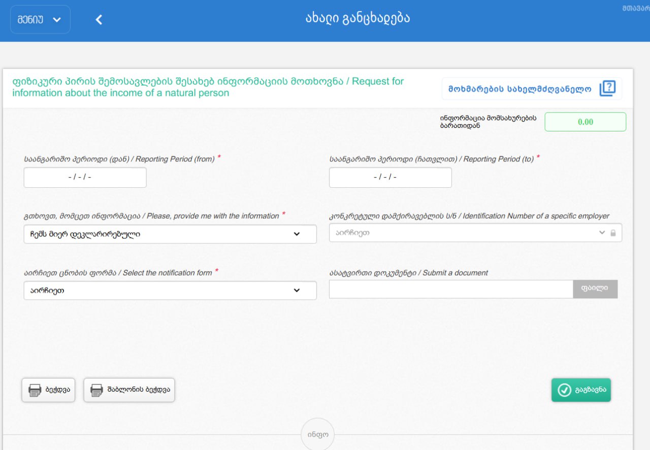 ▪️На странице подачи заявки нужно указать период, за который вы хотите получить справку (в разделе „საანგარიშო პერიოდი“ / “Reporting period”). Далее — выбрать, справку какого типа вы хотите, в разделе „გხოვთ, მომცეთ ინფორმაცია“ / “Please provide me with information”.