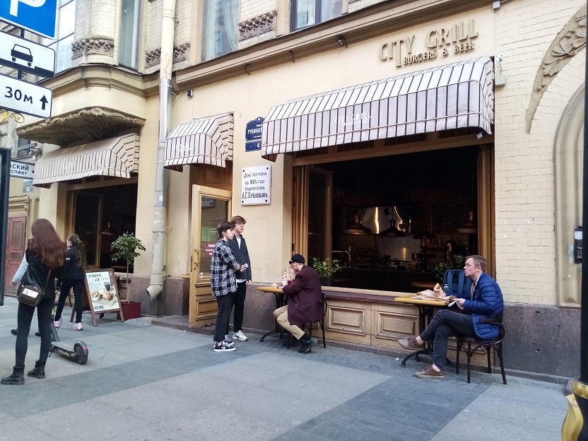 На улице Рубинштейна у части кафе, работающих навынос, стоят столы и стулья, за которыми сидят посетители.