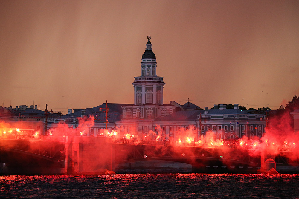 На «Газпром Арене» вечером 8 июля прошла церемония награждения «Зенита» — петербургскому клубу вручили кубок Российской премьер-лиги за досрочную победу в турнире. Основная же часть празднования прошла на Неве: в честь команды запустили салют, а на Дворцовом мосту фанаты зажгли десятки файеров. «Бумага» публикует одну фотографию.