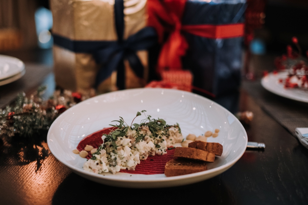 Ресторан «Блок» вместо традиционного оливье предлагает попробовать в новогодние праздники форшмак из сельди с печеной свеклой и хумусом. В заведении, которое расположено в Таврическом саду, блюдо стоит 280 рублей.