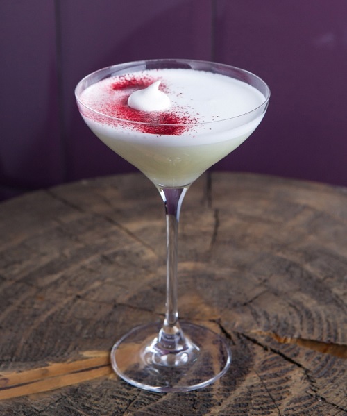 Смешать все ингредиенты в шейкере и взбивать около минуты. Затем перелить напиток через сито в охлажденный бокал и украсить маленьким безе.