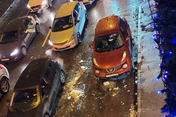 Наледь разбила лобовое стекло автомобилю на платной парковке у дома 36 на Фонтанке, 23 декабря. Фото: «Мегаполис | ДТП и ЧП | Санкт-Петербург | Питер» / Telegram