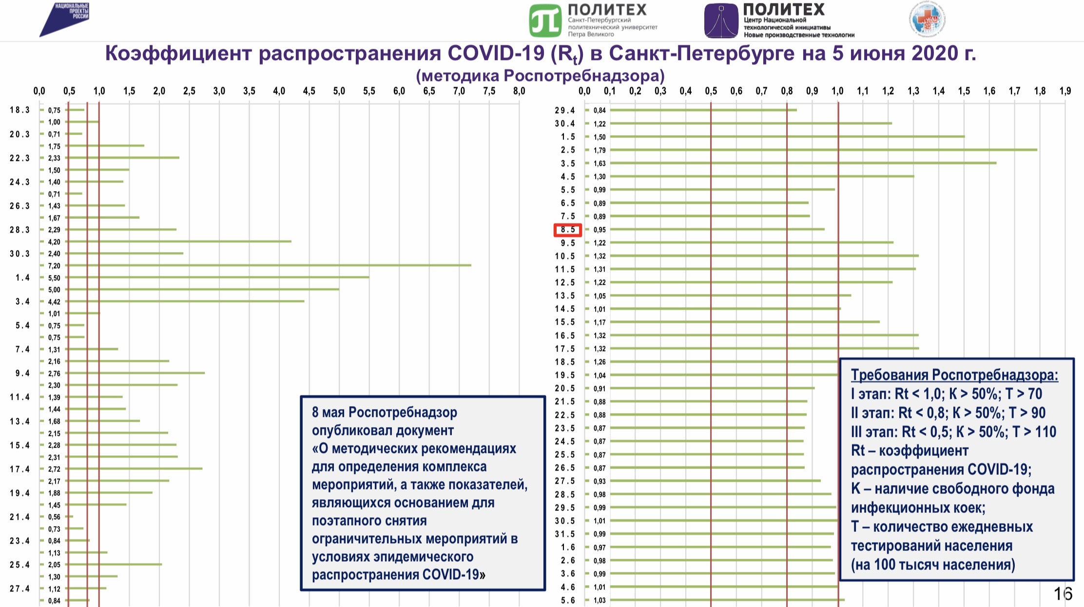 — Первое требование Роспотребнадзора для первого этапа снятия ограничений — коэффициент Rt ниже единицы. Для второго этапа он должен быть ниже 0,8, для третьего — ниже 0,5. По состоянию на 4 июня у нас коэффициент 1,01. Повторюсь, мы уже неделю находимся в районе единицы.
