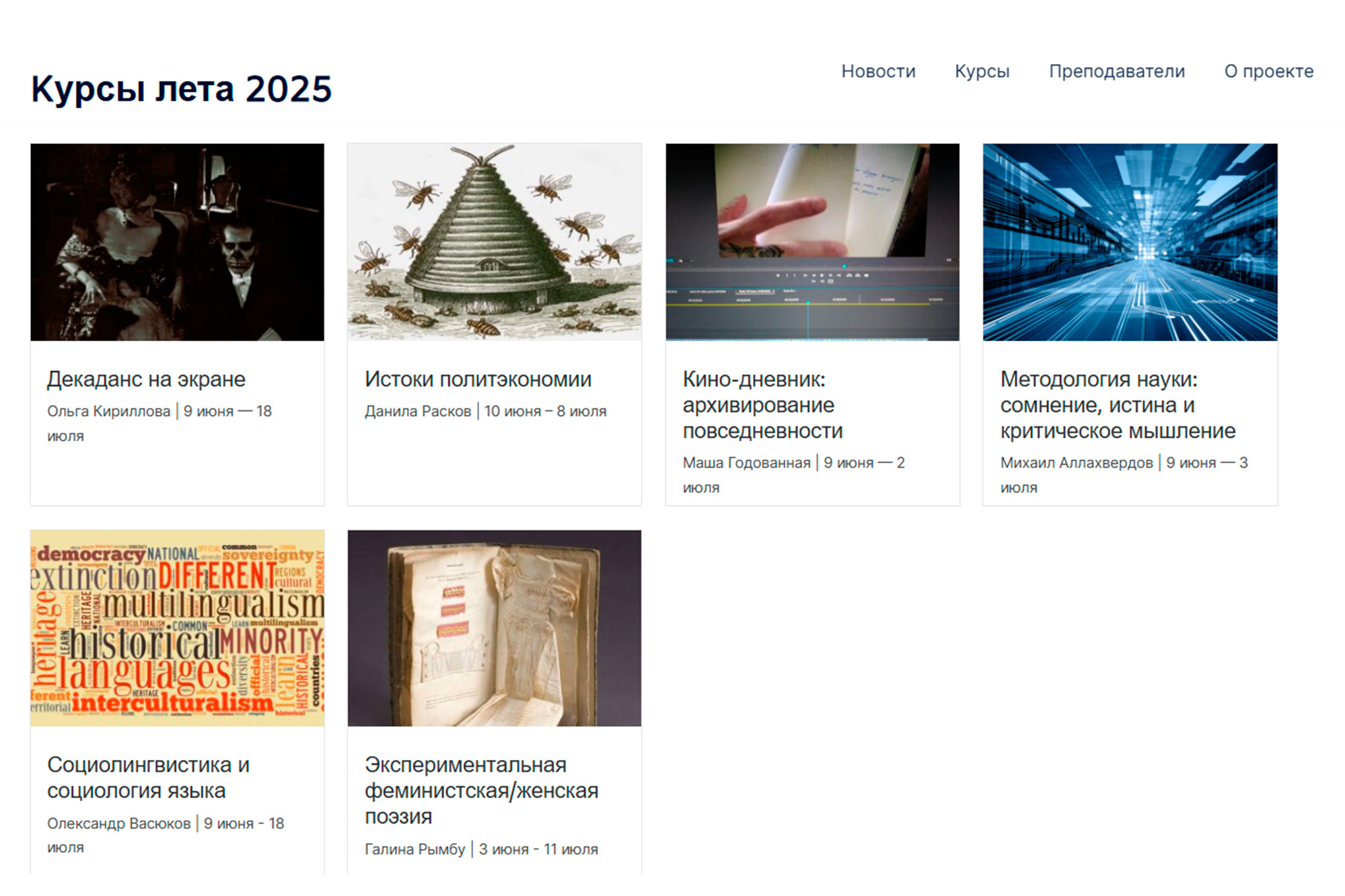 Этим летом SBB предлагает шесть курсов: «Декаданс на экране», «Истоки политэкономии», «Кино-дневник: архивирование повседневности», «Методология науки: сомнение, истина и критическое мышление», «Социолингвистика и социология языка», «Экспериментальная феминистская/женская поэзия».
