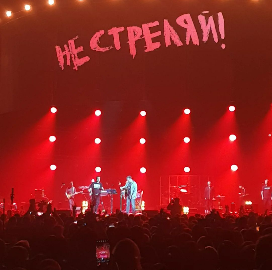 На сцене во время концерта появлялись надписи «Нет войне» и «Не стреляй» — так называется одна из песен группы.