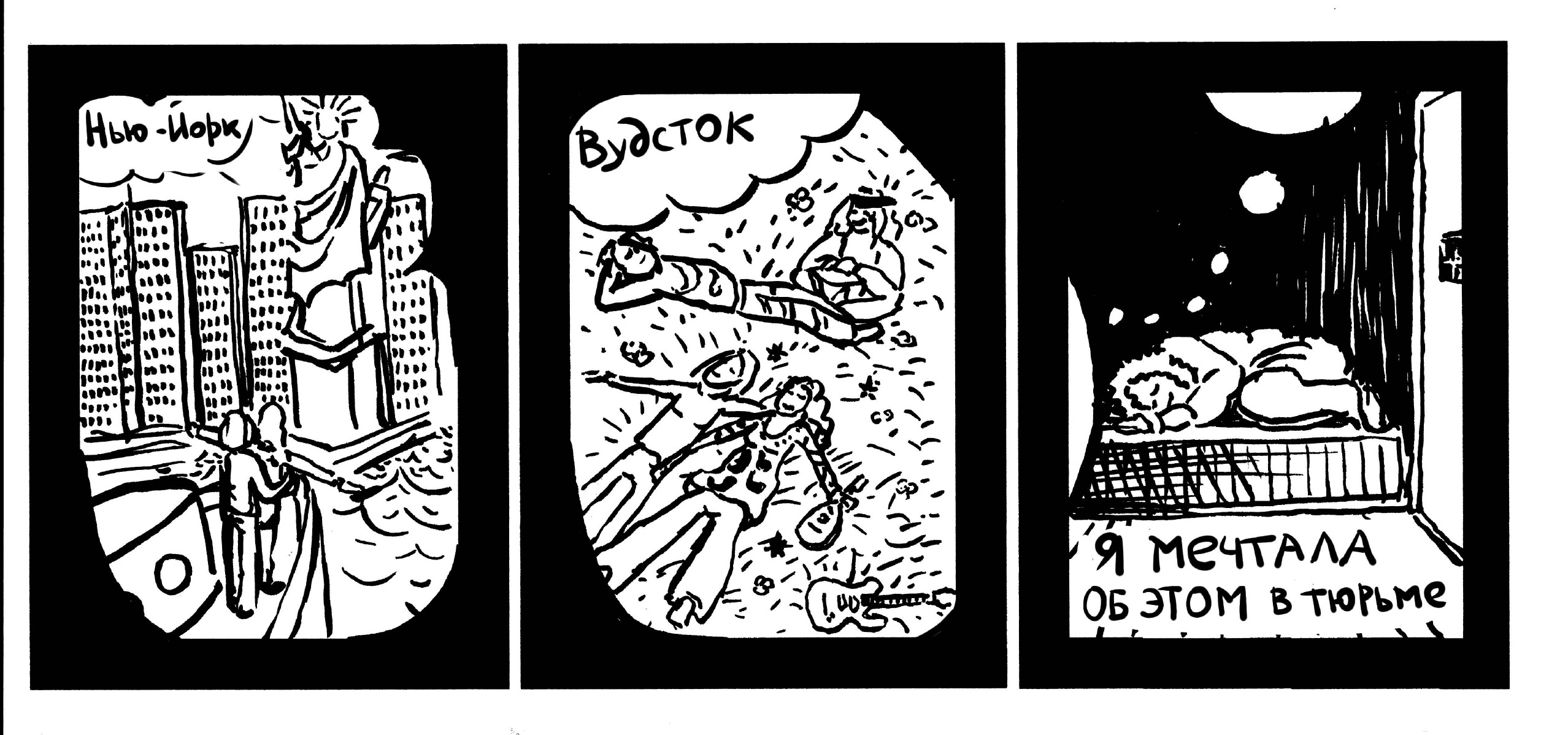 — Идея книжки пришла в первые дни ареста. И как только до меня доползли ручки, карандаши и бумага, я стала рисовать ее целыми днями. Но я не могла рассказать в книге всё, что хотела, пока сидела в тюрьме, потому что ее могли найти и отнять. При первом обыске ее даже нашли и хотели забрать так как подумали, что это мне пронесли и передали какую-то литературу. Но потом обыскивающий понял, что я сама рисую, ему понравилось, он очень восхищался.