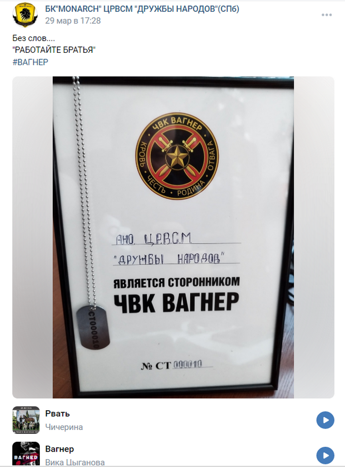 Боксерский клуб «Монарх» (пр. Большевиков, 22, к. 6) еще 4 марта в группе во «ВКонтакте» сообщил об открытии у себя регионального центра набора бойцов в ЧВК. Это единственный из списка спортивный центр, который открыто поддерживает «вагнеровцев» и упоминает в соцсетях участие в вербовке. На странице клуба появляются посты с песней Вики Цыгановой «Вагнер» и призывом: «Работайте, братья!»