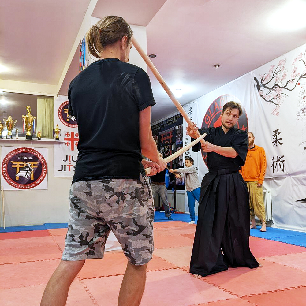Сказано — сделано. Я нашел местное додзё (место, где изучают боевые искусства, или просто спортзал — прим. Paper Kartuli), вышел на его владельца Гиорги — чемпиона мира по бразильскому джиу-джитсу — и предложил ему открыть на базе его площадки кобудо-центр. Ему идея понравилась, так у меня появилась моя собственная секция — «Кобудо Тбилиси».
