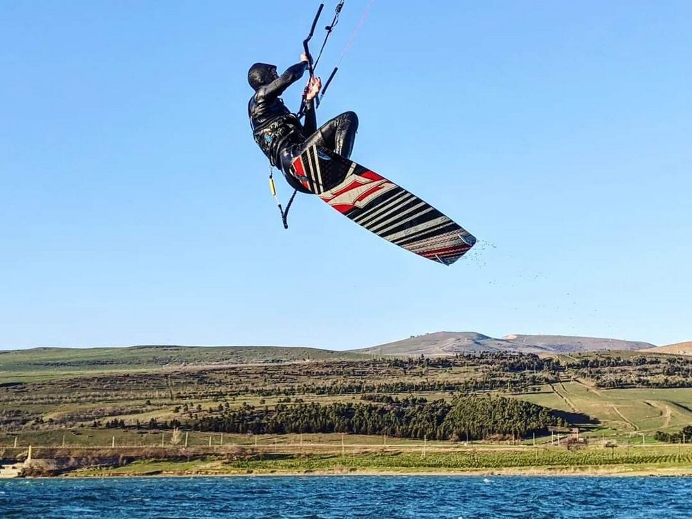 Второй летний спот, Надарбазеви — немного дикое место, неглубокое озеро, окруженное горами, в 50 минутах езды от Тбилиси на машине. Здесь не ловит связь, зато хорошо и стабильно дует. Правда, летом часто не сбывался прогноз. Еще здесь периодически случались соревнования у рыбаков, и нам запрещали выходить на воду.