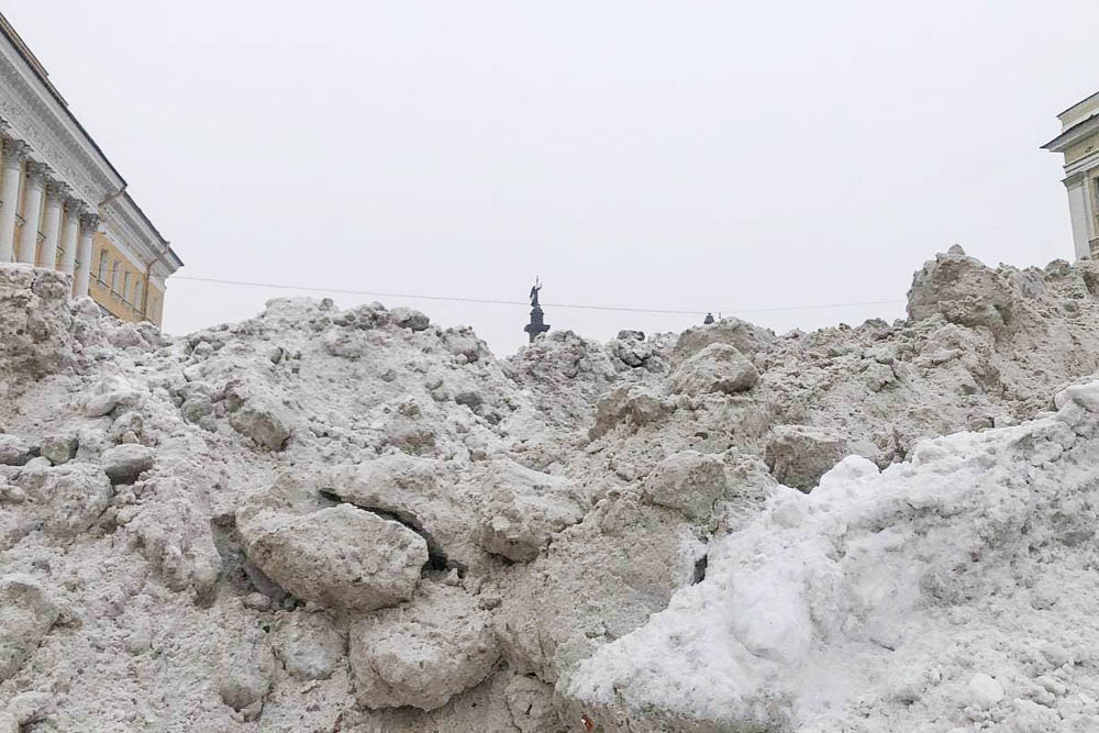 Показываем три фотографии снежных гор, закрывающих вид на Эрмитаж.