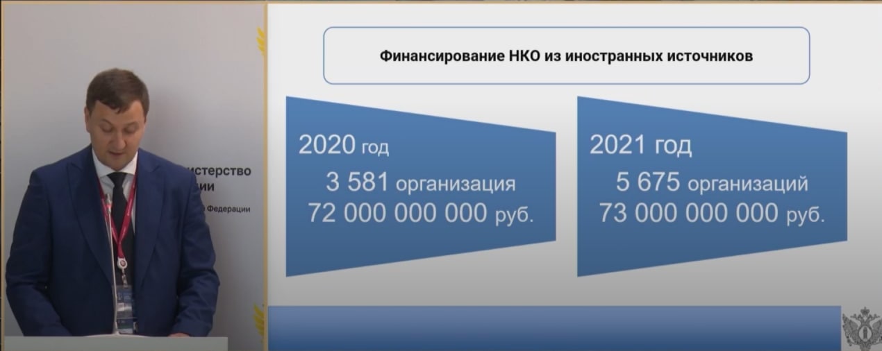 По словам Цыганова, в 2020 году 3581 российская НКО получила из «иностранных источников» 72 миллиарда рублей, а в 2021 году — 5675 НКО получили 73 миллиарда. Откуда эти данные, он не уточнил.