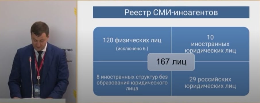 В среду, 29 июня, на Петербургском международном юридическом форуме выступил представитель Минюста Роман Цыганов. Он объяснил, кого ведомство считает «иностранными агентами». Так, по его словам, «иноагенты» — это НКО, которые не признают Крым, исследуют проблемы безнаказанности преступлений и выступают в поддержку «Мемориала».