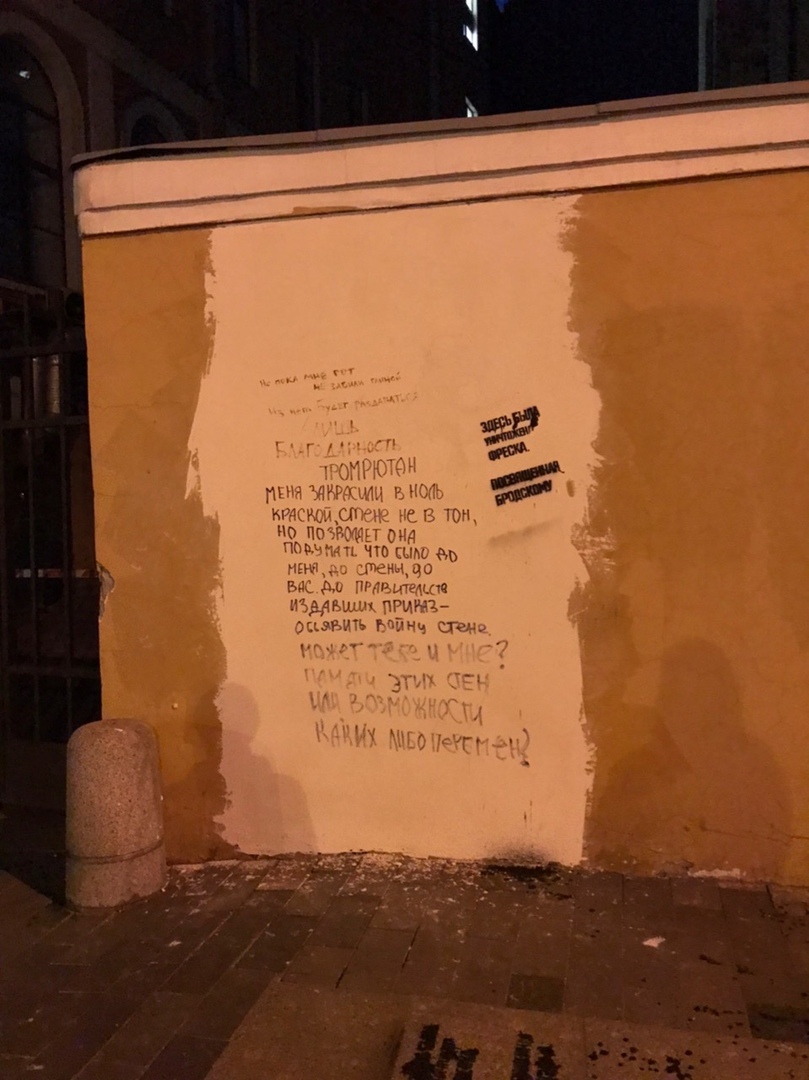 Сторонники «Другой России» добавили поверх надписей трафаретное граффити «Здесь был Бродский» и призвали другие протестные группы не оставлять стену надолго пустой.