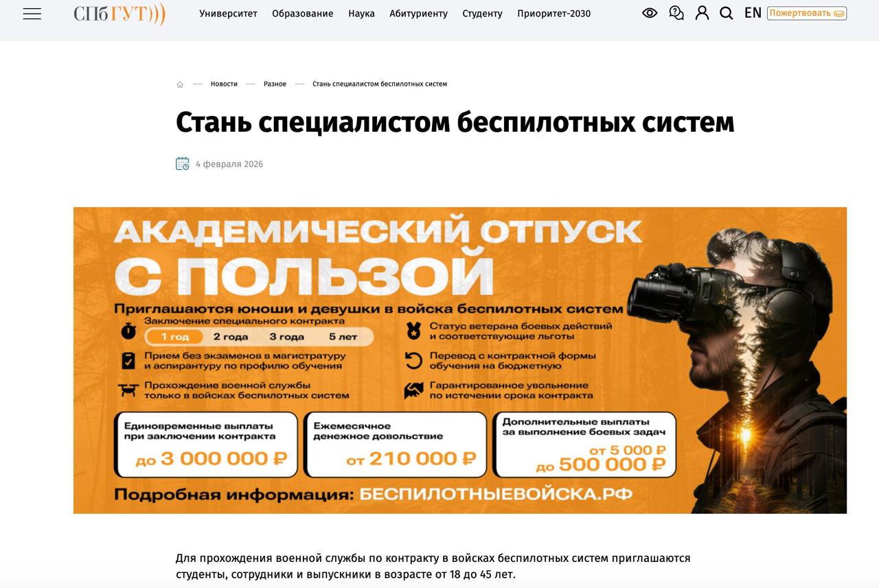 Объявления в вузах — часть масштабной кампании Минобороны по набору контрактников в войска беспилотных систем (БПЛА). Формирование этого вида войск как отдельной структуры началось в прошлом году, но активный отбор кандидатов стартовал в середине января 2026-го.