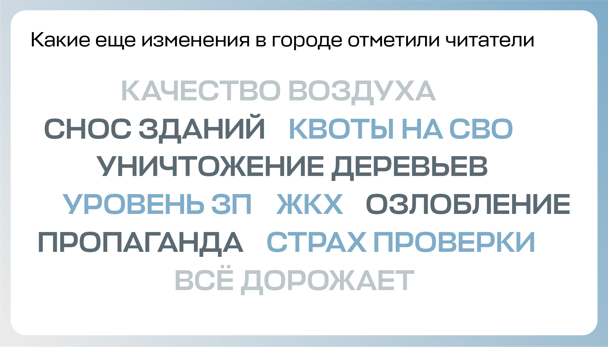 Мы спросили читателей, какую реакцию на основные изменения в городе они видят в своем окружении. 80 % отмечают возмущение ростом цен, 35 % наблюдают возмущение из-за угрозы от беспилотников и 44 % — из-за блокировок. По мнению 54 %, окружающие в основном сопротивляются блокировкам: ищут пути обхода, идут на конфликт с начальством, помогают другим с VPN.